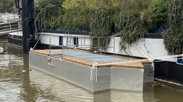Le bateau FRIPONNE, amarré rive gauche de la Saône à Lyon 2ème expérimente la phytoépuration pour traiter ses eaux usées, en partenariat avec CDV CONSTRUCTION (CARRÉ DE VIE), AQUATIRIS, les VOIES NAVIGABLES DE FRANCE (VNF), la Métropole de Lyon et l'INRAE ...